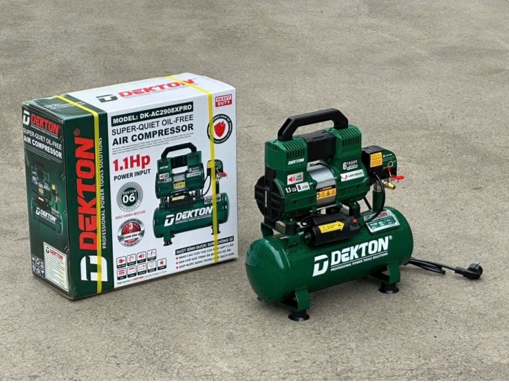 Trong các công việc cần việc cần đến khí nén như vệ sinh thiết bị, thổi bụi máy tính, bơm xe, phun sơn, hoặc hỗ trợ các thiết bị dùng khí tại phòng khám nha khoa, máy nén khí không dầu là lựa chọn hàng đầu nhờ đặc tính sạch, không phát sinh khí độc và ít ồn. Trong đó, máy nén khí Dekton DK-AC2908XPRO là dòng máy nổi bật, được ưa chuộng nhờ thiết kế nhỏ gọn, vận hành êm ái và độ bền cao.